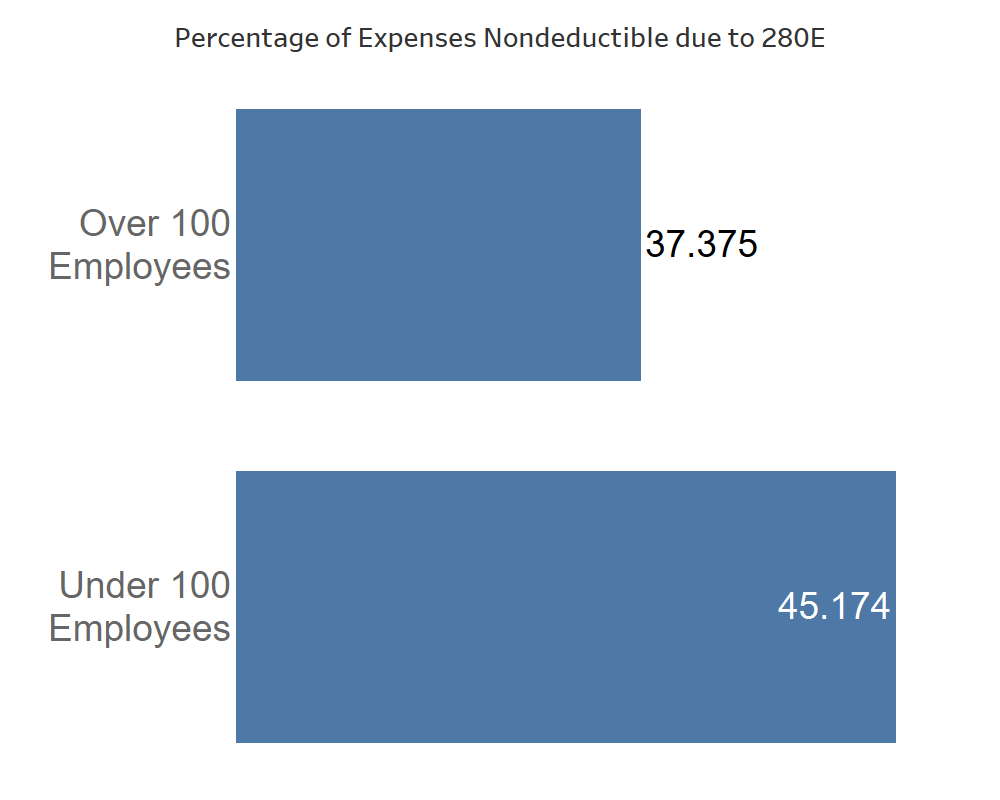 The 280E tax already hits smaller operators harder, as they report a greater percentage of nondeductible operating expenses due to 280E (45% vs. 37% of operating expenses), and make long-term choices based on tax constraints rather than business needs: