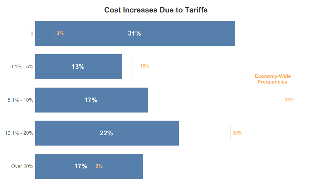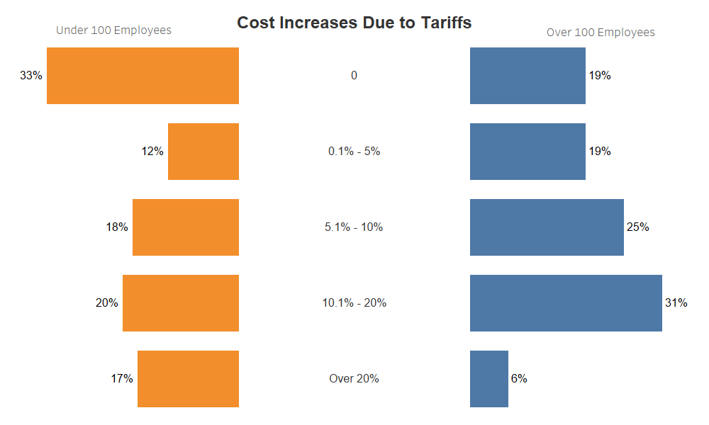 The size gap: Smaller businesses are nearly three times as likely as larger companies to report cost increases exceeding 20% (17% vs. 6%). Larger operators can hedge by locking in long-term purchase agreements or pre-ordering inventory, smaller operators absorb higher costs in real-time.