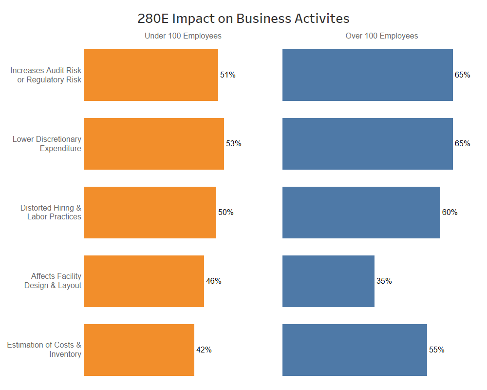 Hard-to-reverse design choices: Perhaps most concerning, smaller companies (46%) report that their physical layouts are dictated by tax considerations, e.g., limiting outlays on retail sales space because it is harder to deduct. Unlike a spending policy, these physical facility layouts may be difficult to "reverse" once rescheduling relief finally arrives.