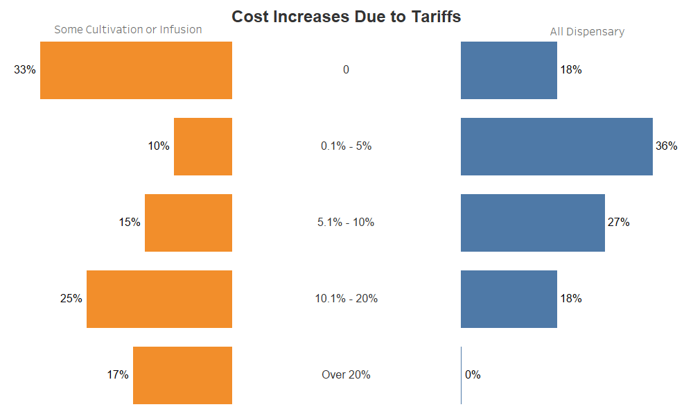 Production vs. retail: A heavier burden falls on cultivation and infusion operations that rely on imported packaging products, buildouts, and high-tech hardware. One in six companies with cultivation and infusion operations (17%) report cost spikes exceeding 20%, while no dispensary-only company reported this impact.