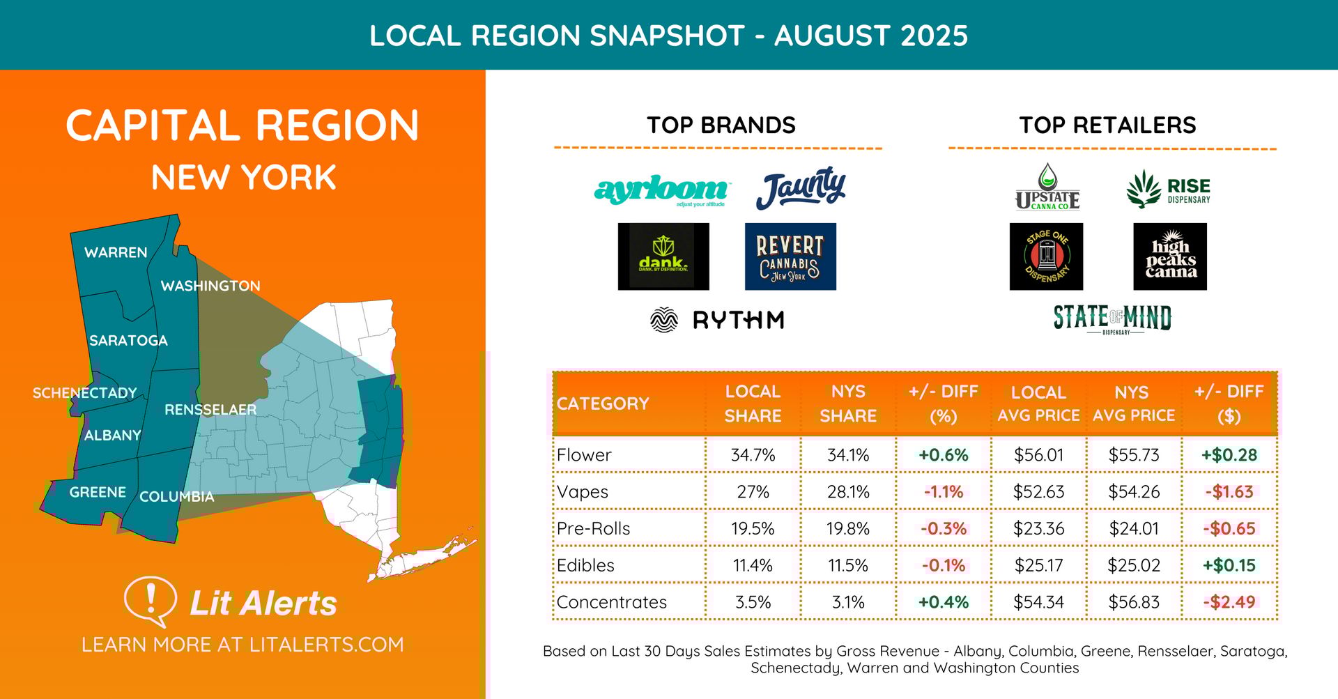 The New York power brands Ayrloom, Jaunty, and Dank continue to show their dominance in another region of New York. These brands have been present in all New York regional category leader charts that Lit Alerts has provided exclusively to Cultivated readers.